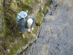Nous sommes maintenant à 2000m, à côté d’une bergerie, qui a vu la toiture soufflée cet hiver par une avalanche. L’endroit nous semble propice pour se reposer et manger. Il fait vraiment bon au soleil. Roland pénètre dans la bergerie et nous appelle, il y a des découvertes à faire. Cette bâtisse a été occupée l’été dernier, tout est encore en place, prêt pour la prochaine saison, même l’odeur des moutons est encore bien là. Il y a aussi une dame-jeanne de 50l. aux ¾ pleine de vin rouge, qui n’est pas mauvais du tout… Il y a aussi de magnifiques chaudrons en cuivre, qui servent à la fabrication du fromage. Cette bergerie est toute neuve, mais construite trop près du couloir à avalanches, elle n’a pas résisté, tandis que sa très vieille sœur, qui est tout près, n’a pas souffert, elle devra certainement reprendre du service. Maintenant il faut repartir, la pause a été assez longue, mais avec le beau temps, nous ne sommes pas pressés. Nous apercevons le refuge au-dessus d’un éperon rocheux, qu’il nous faudra gravir en le contournant. Ce sera un peu plus dur, pour le moment c’est assez plat. Nous remontons toujours le torrent, qui est tantôt sous la glace, tantôt à l’air libre. Nous arrivons à un petit pont. Là nous faisons le plein des gourdes avant d’attaquer le raidillon qui nous mènera en haut. Nous allons pouvoir tester la condition physique. Je mets les cales de montée, qui s’avèrent bien pratiques, lorsque la pente est raide.