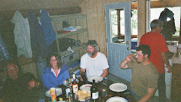 Nous nous retrouvons tous un peu plus bas pour la descente. Nous suivons Michel qui cherche toujours les meilleurs coins, là où il y a moyen de s’amuser. Tout le monde y trouve son compte, il y a de belles pentes raides qui ne reçoivent jamais le soleil, là la neige reste très longtemps poudreuse. Le brouillard a disparu et nous sommes maintenant à l’abri du vent. Michel a des problèmes avec ses montures et pourtant c’est du matériel neuf, autrichien en plus, on ne sait vraiment plus à qui se fier. Nous prenons notre temps pour descendre, les pentes sont très belles, il doit y faire bon dans un mètre de neige fraîche. Le beau temps est revenu, nous nous régalons. La caméra tourne souvent en espérant avoir quelques beaux souvenir. Maintenant que nous sommes plus bas, il fait très beau. Nous arrivons déjà en vue du refuge. Encore une très belle descente, que nous attaquons de front sous l’œil de la caméra de Max, qui est déjà en bas. Nous retrouvons la baraque et nos sacs, cet après-midi il y a de la place, nous nous installons donc, en situation régulière cette fois. Michel nous fabrique une table en un tour de main, la menuiserie il aime çà. Max, lui, c’est les skis sa passion. Il répare ceux de Michel, il démonte tout avec le matériel de fortune dont nous disposons. J’ai un peu peur, mais il réussira tout de même une bonne réparation, heureusement. Nous mangeons copieusement, puis chacun vaque à ses occupations. Après le soin des pieds, le plus important est de trouver un beau coin, au soleil si possible, à l’abri du vent. Nous ne nous lassons pas de contempler les sommets environnants, quel site et quel calme, c’est vraiment impressionnant !